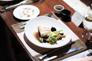 second-course Second course: Pan-fried Grouper, Cauliflower Curry Cream, Muscatel Raisins, Baby Gem Lettuce and Red Wine Coulis