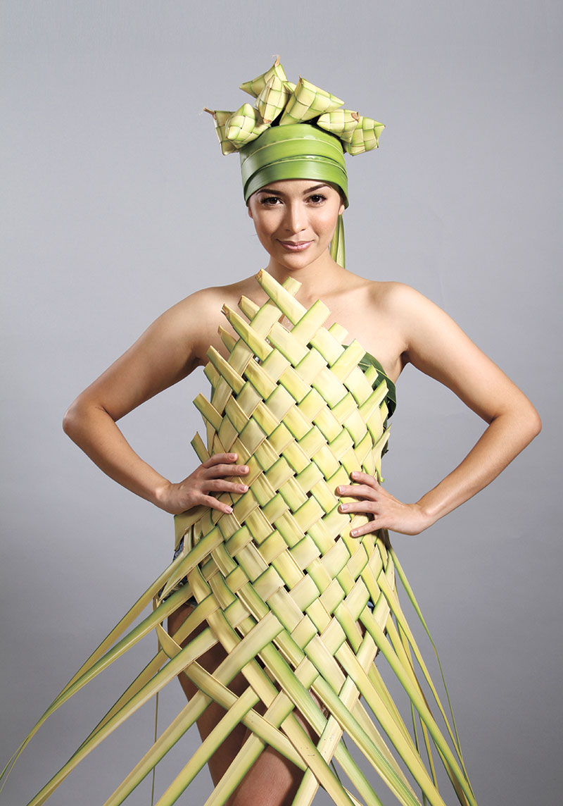 They wove the fresh yellow-green palm fronds, or lukay, into a mat-like material (left) that the model wore over a lukay wrap with a darker shade of green (below).