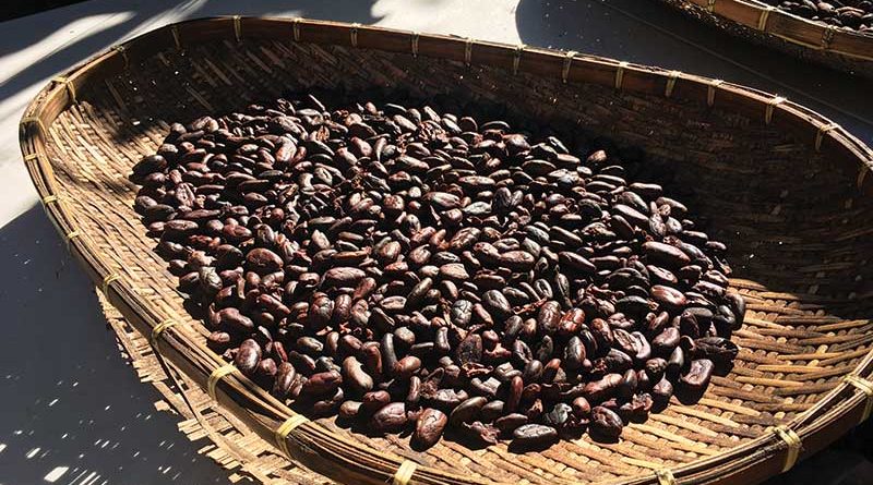 After that is the winnowing of the beans to remove the shells. During The Chocolate Journey, the traditional winnowing bamboo basket was used to show how the process works. The shells of the roasted beans are removed, leaving fresh cacao nibs.