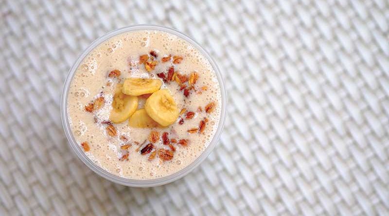 While peanut butter may be high carb, it’s tasty, satisfying, and contains healthy fats and protein that help meet a gym junkie’s nutritional needs. Soy milk, again, provided the protein-packed, non-dairy base with organic peanut butter adding a nutty flavor. Banana adds weight with its classic PB-complementary profile. Banana slices, granola, and chia seed toppings add nutritious texture, too.