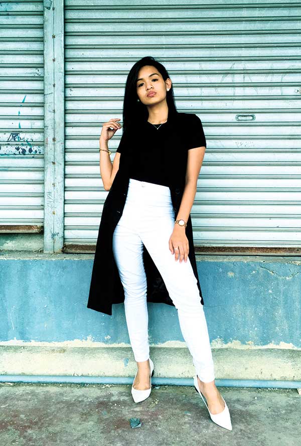 “The Philippine weather could be quite unpredictable so my cold weather style usually revolves around layering. First, I pick out a top that would still make me feel comfortable even if the weather gets warmer over the course of the day like a short-sleeved shirt or a flowy blouse. I then pair it with pants or jeans for full coverage on my legs. To maintain variation in my outfits, I choose bottoms in different cuts, styles, and prints. I then top off my cold weather outfits with outerwear like a tailored blazer, a vest, or a cardigan so that I could just remove it in case the weather changes. For this ensemble, I chose one of my favorites which is this black ribbed short sleeved top which works well in keeping me warm but its sleeves are short enough to keep me cool if the temperature rises. I then matched my top with a pair of white skinny jeans to give this outfit a polished look. To top it all off, I chose to wear this long vest that’s thick enough to shield me from the cold weather.”