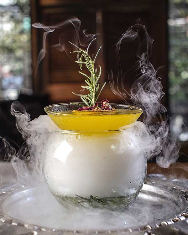 The aroma and flavor of rosemary complement the bittersweet botanical base of gin. To this, the citrusy sweetness of Dalandan liqueur intermingles as accentuated by citrus bitters and fruity-floral Batangas honey. Turmeric extends the orange note in its pungency along with that of ginger – sharp to the nose with a pleasant zing in the mouth. An herbed saline solution binds all these complexities in this cocktail served in a stemless martini glass over a bowl of vaporizing dry ice.