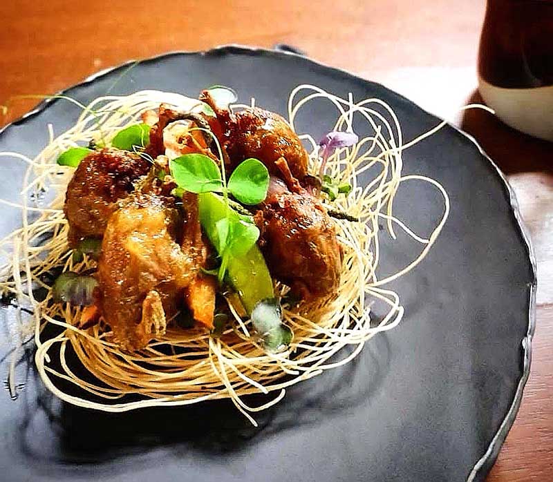 Executive Chef, Nino Laus, is not to be outdone with his three-course a la carte menu. Of the solid lineup, we first tucked into the Balut at Chicharon – extra rich and smooth duck egg custard and, the unmistakably, balut puree in a half-shell with house chicharron the size hand towels. Our second dish, Manok, was the closest I got, so far, to my wet dream of eating Ortolan. A confit of day-old chick is stuffed with Vigan longanisa and nestled on crispy miswa along with roasted dalandan, microgreens and Ilocos black garlic all drizzled with Penoy sauce.