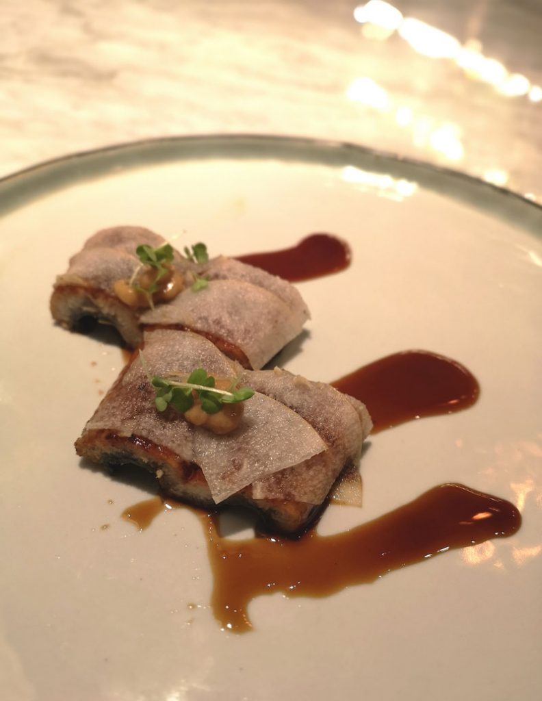Succulent and deliciously fatty slow-roasted and smoked Angus beef short ribs sit on an Akashi red whisky reduction in shiitake and anchovy cream. A drizzling of red wine and beet sauce plays up the rareness of the meat. The Tokyo Toji cocktail leans towards the fruity with cherry blossom vermouth, Orange Bitters, Bittermens Xocolatl bitters added to the Akashi Toji a whisky extend the fruity and smoky flavors of the dish.